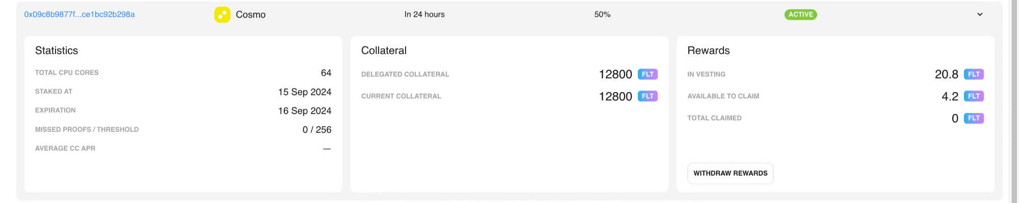 Total CPU cores: Number of Compute Units (CU) in this Capacity Commitment (CC)Staked at: The date when this Capacity Commitment was stakedExpiration: The date when this Capacity Commitment will end and stop earning rewards unless it fails earlierMissed proofs / Threshold: How many times have this CC's CUs failed to submit Proofs; How many failures are allowed before it's considered failed.Average CC APR: The estimated yearly return rate, based on the average of rewards earned so far